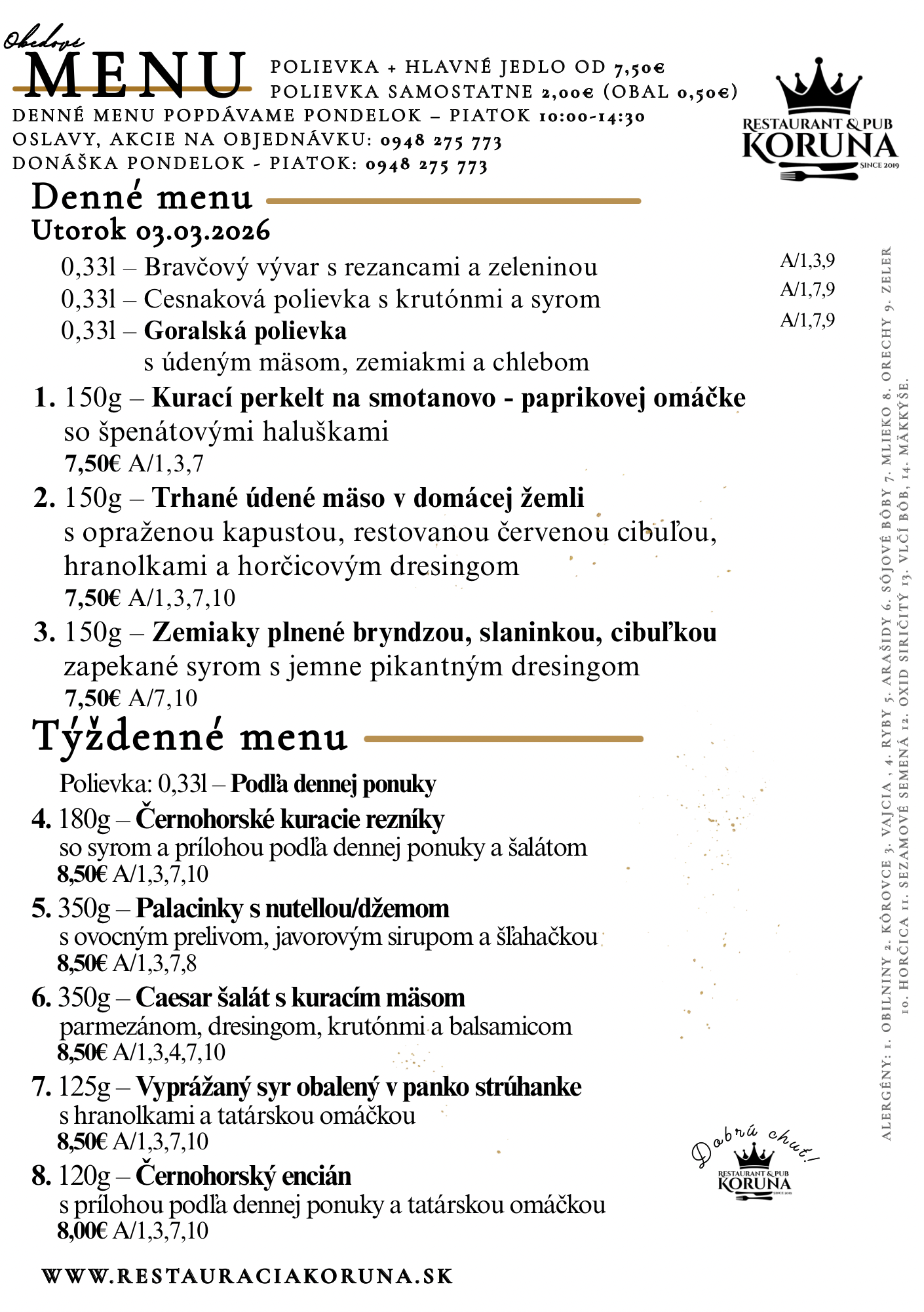 Reštaurácia Koruna ponúka počas týždňa chutné a poctivé obedové menu z čerstvých surovín. Víkendy patria oslavám – či už ide o narodeniny, svadby, výročia alebo firemné akcie. Postaráme sa o všetko, aby ste si svoj výnimočný deň užili bez starostí, v príjemnom prostredí v rukách profesionálov. Sme miesto, kde sa stretáva chuť, pohostinnosť a oslava života.